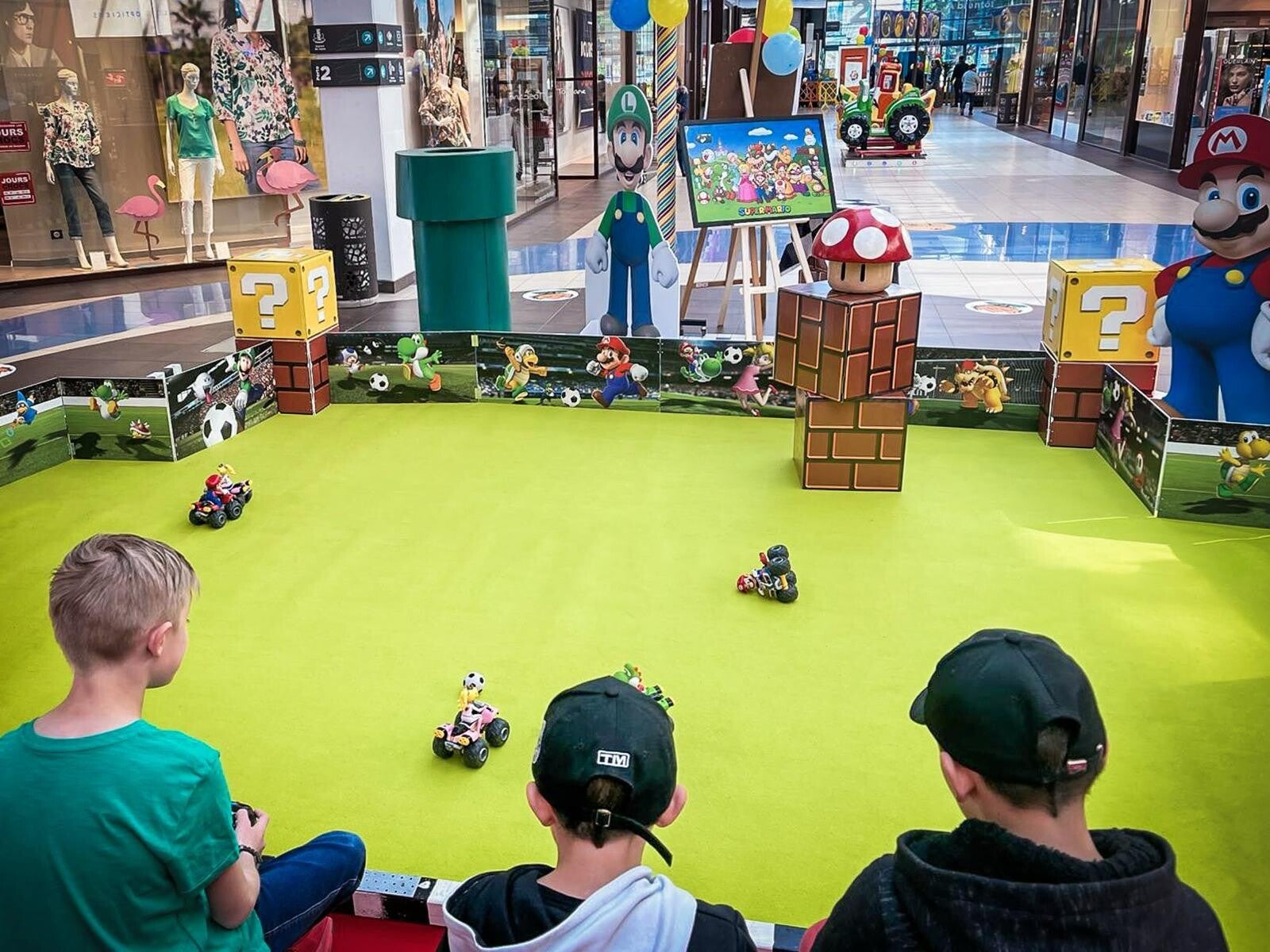 Plonger dans l'univers Mario avec comme activité un match de foot en voiture télécommandée et un décors inspiré du jeu .
